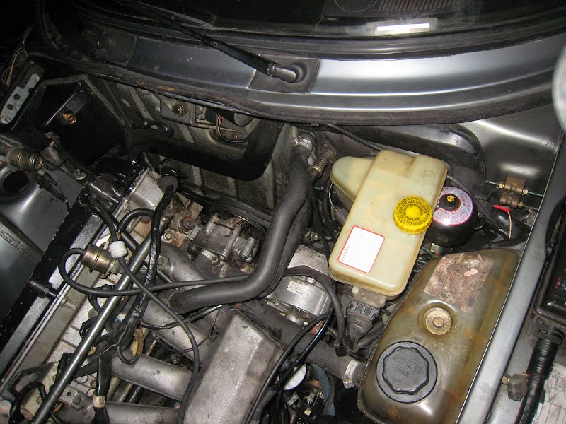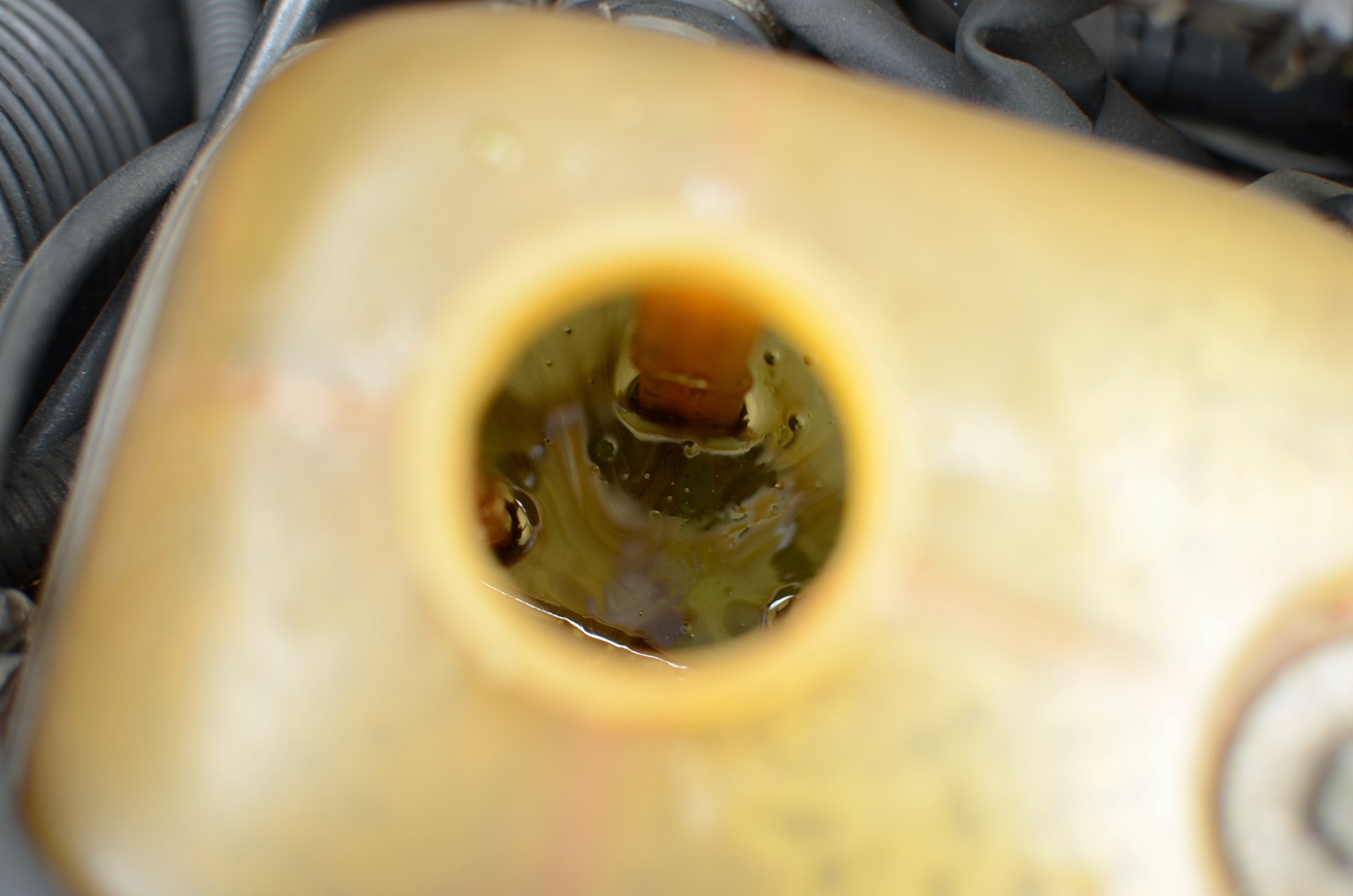 Controleer het koelwater (het expansievat zit dicht bij de voorruit aan de bestuurderskant) op niveau en oliesporen (dit duidt mogelijk op koppakkingsproblemen). Het water mag wel wat troebel zijn, maar geen olieplas bevatten. Grijzige aanslag aan de binnenzijde is een trefzekere aanwijzing voor koppakkingsproblemen.