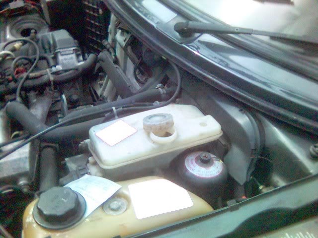 Het remvloeistofreservoir: de remolie (SAE DOT 4) moet mooi helder zijn.